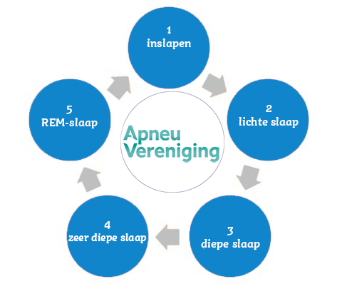 Als je slaapt, doorloop je meerdere keren een cyclus van ongeveer 1 ½ uur. Deze slaapcyclus kent 5 fases. Mensen met apneu komen door hun ademstops vaak niet in het stadium van diepe en zeer diepe slaap.